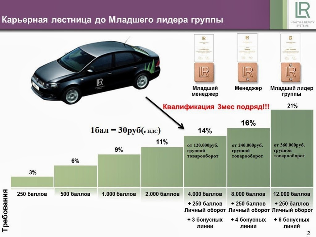Уже на первых этапах карьеры новый партнер имеет возможность достичь того уровня оборота продукции LR, который позволит ему стать частью уникальной автопрограммы LR и стать обладателем нового автомобиля VW Polo.