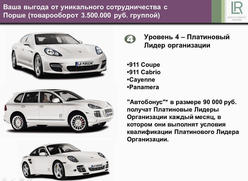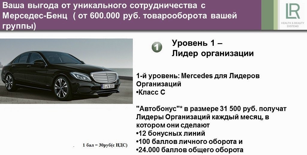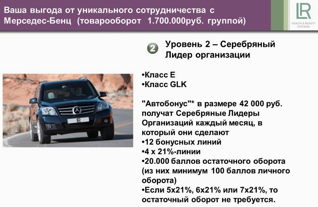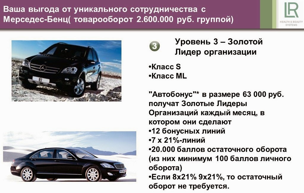 На следующих этапах карьеры внутри компании LR успешные партнеры имеют возможность приобрести автомобили разных моделей: от спортивных авто SLK-класса, просторных моделей М-класса или элегантных машин S-класса. При достижении соответствующего оборота LR поощряет своих партнеров дополнительным бонусом.