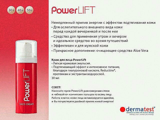«PowerLIFT Face Cream» - это легкая кремовая эмульсия, которая быстро впитывается кожей и интенсивно увлажняет ее. Благодаря таким составным компонентам как Reductine®, гиалуроновая кислота, экстракт водорослей и смесь из экстрактов 7 трав, кожа интенсивно увлажняется и получает больше жизненной энергии. Крем оживляет и укрепляет кожу. Он подходит также и для мужской кожи. «PowerLIFT» подходит для любого типа кожи, требующей больше энергии и упругости.