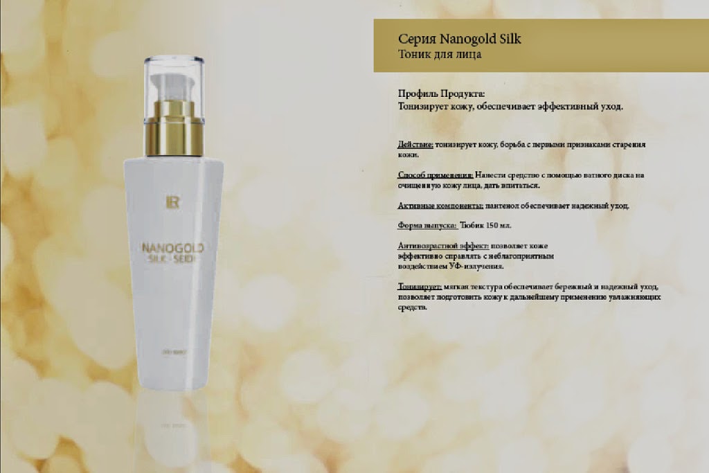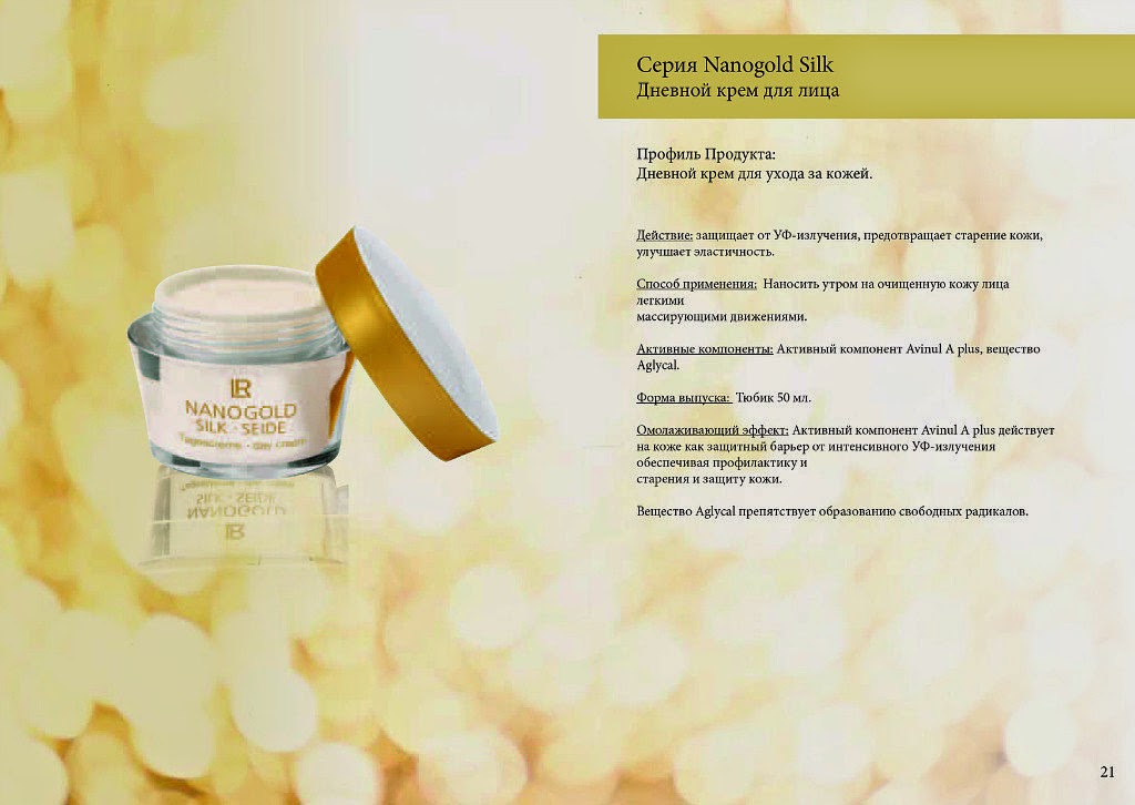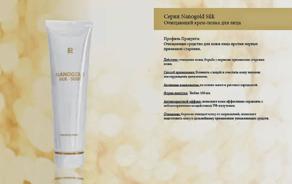 Крем «Nanogold Silk» обеспечивает коже защиту от преждевременного старения кожи, обусловленного действием ультрафиолетового излучения. Комплекс действующих веществ нанозолото и протеины шелка эффективно поглощают ультрафиолетовые лучи. Шелк оказывает пoддержку синтезу собственного коллагена в организме и таким образом сохраняет эластичность кожи.