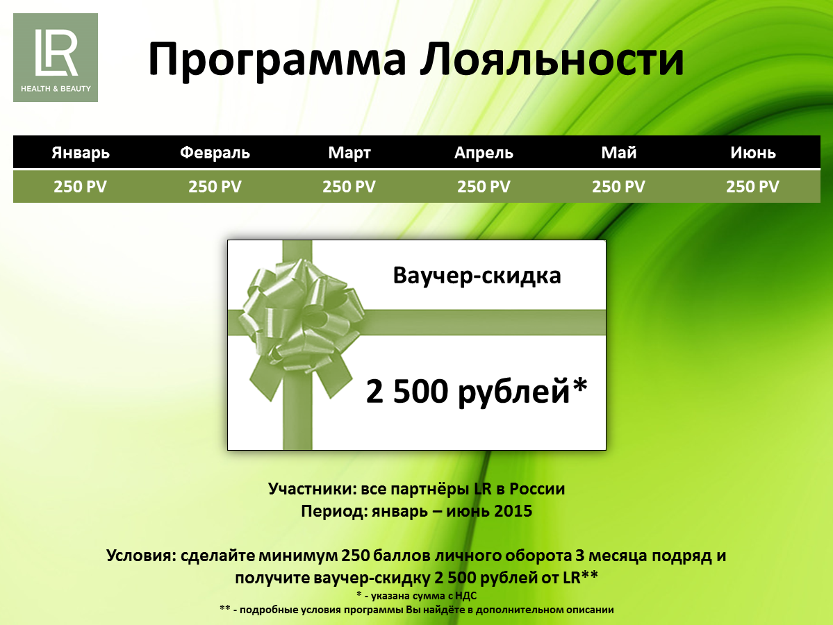 Вы продолжаете участвовать в программе. В апреле Вы выполнили аналогичные условия в третий раз подряд — Поздравляем. Вы получаете ваучер-скидку на 2500 рублей (включая НДС), который сможете использовать на покупку продукции LR в мае 2015 года.