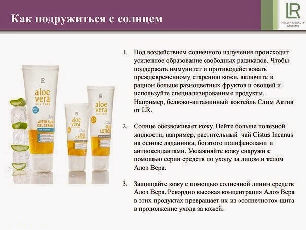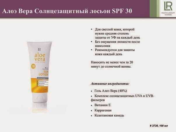 Долгожданное весеннее солнце - нежное, но небезопасное! Солнечная радиация год от года становится все активнее, нанося вред коже, провоцируя преждевременное старение, пигментацию (родинки и веснушки) и даже злокачественные новообразования. Эффективная защита - Aloe Vera Sun Care от LR.